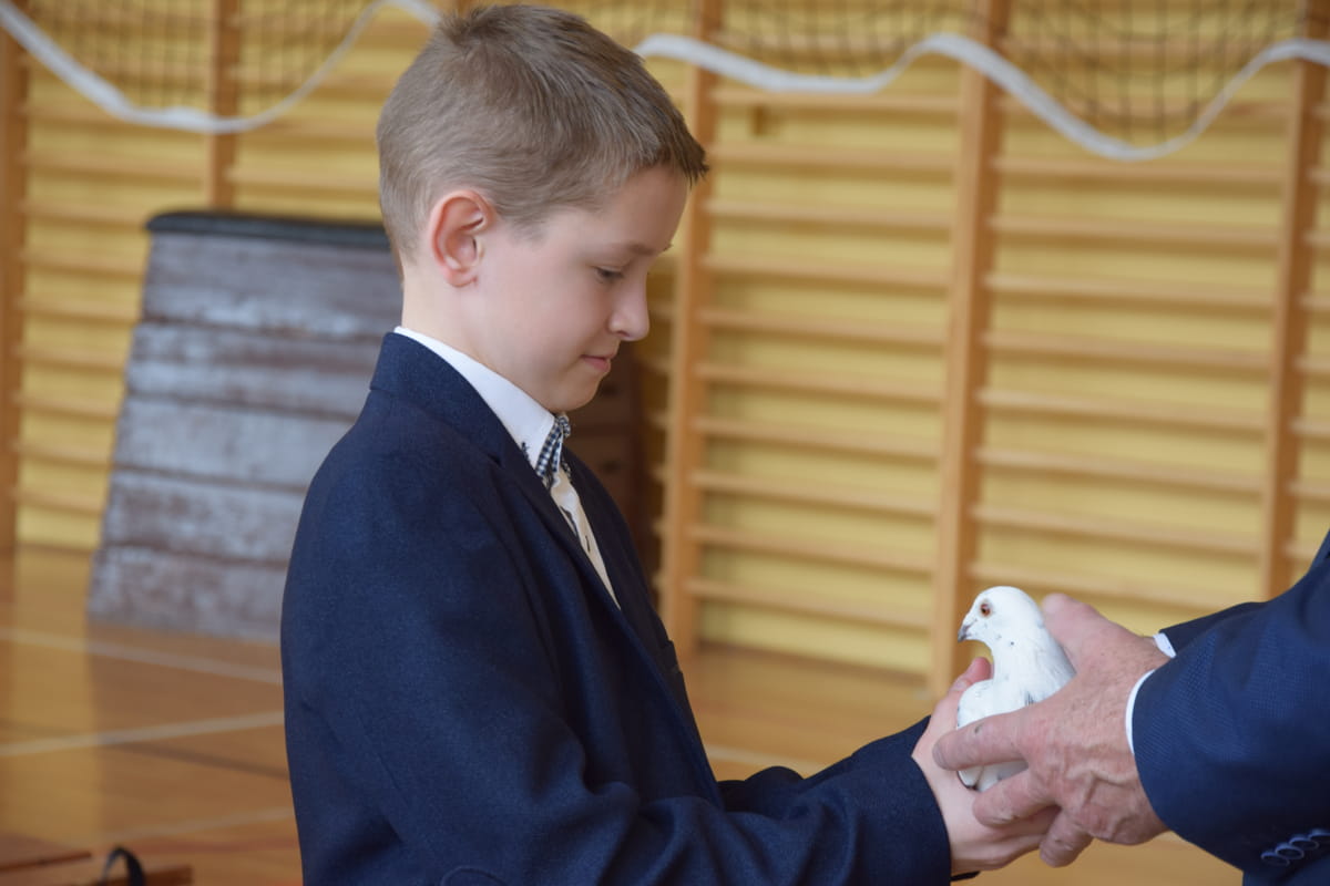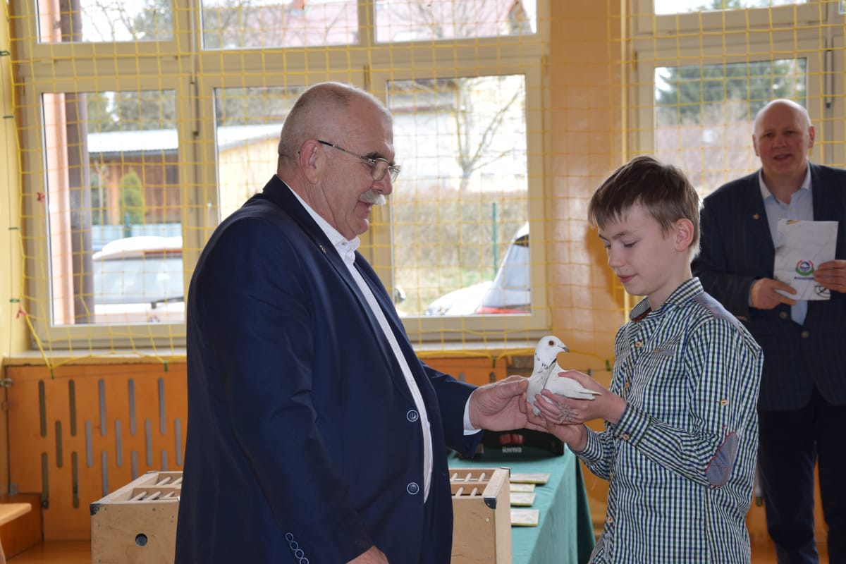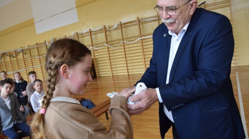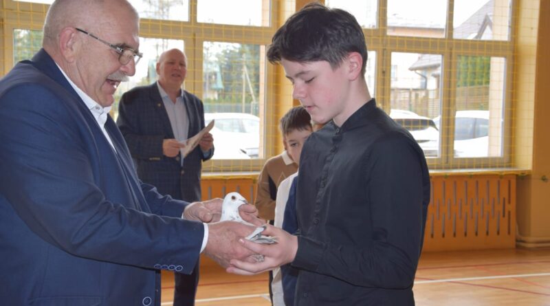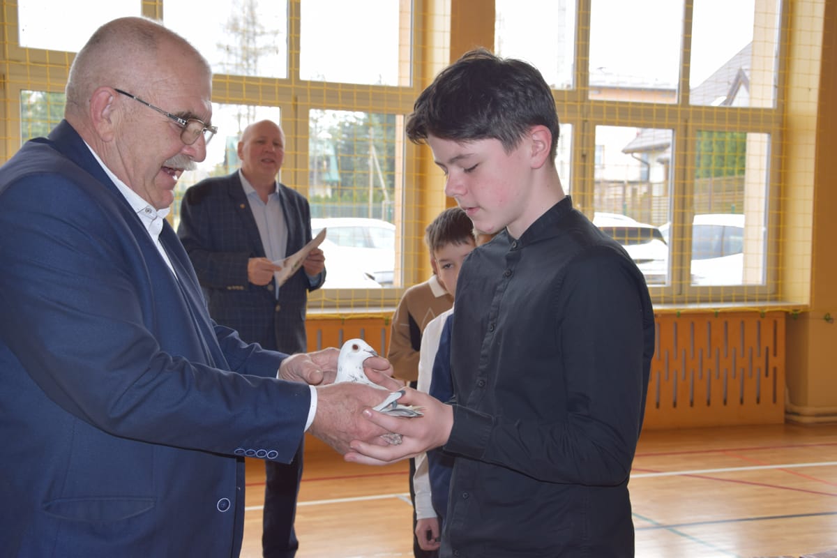 W czasie, gdy komisja konkursowa oceniała prace testowe, uczniowie wysłuchali prelekcji reprezentantów Polskiego Związku Hodowców Gołębi Pocztowych z Oddziału Beskid Sądecki na temat hodowli i lotów gołębi pocztowych.