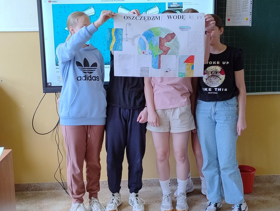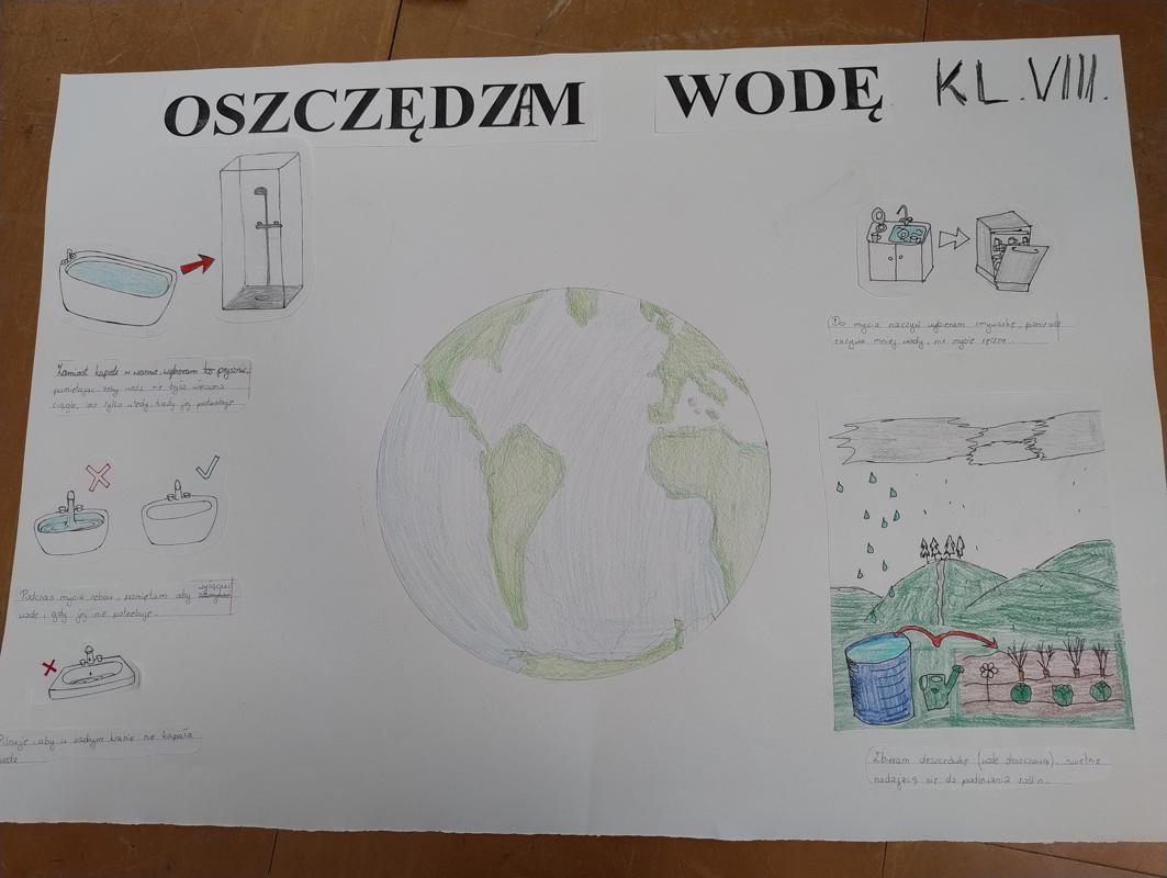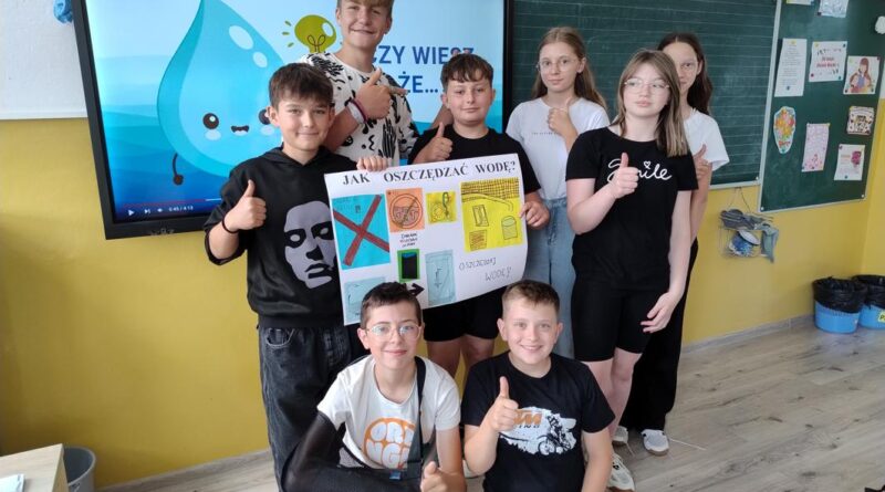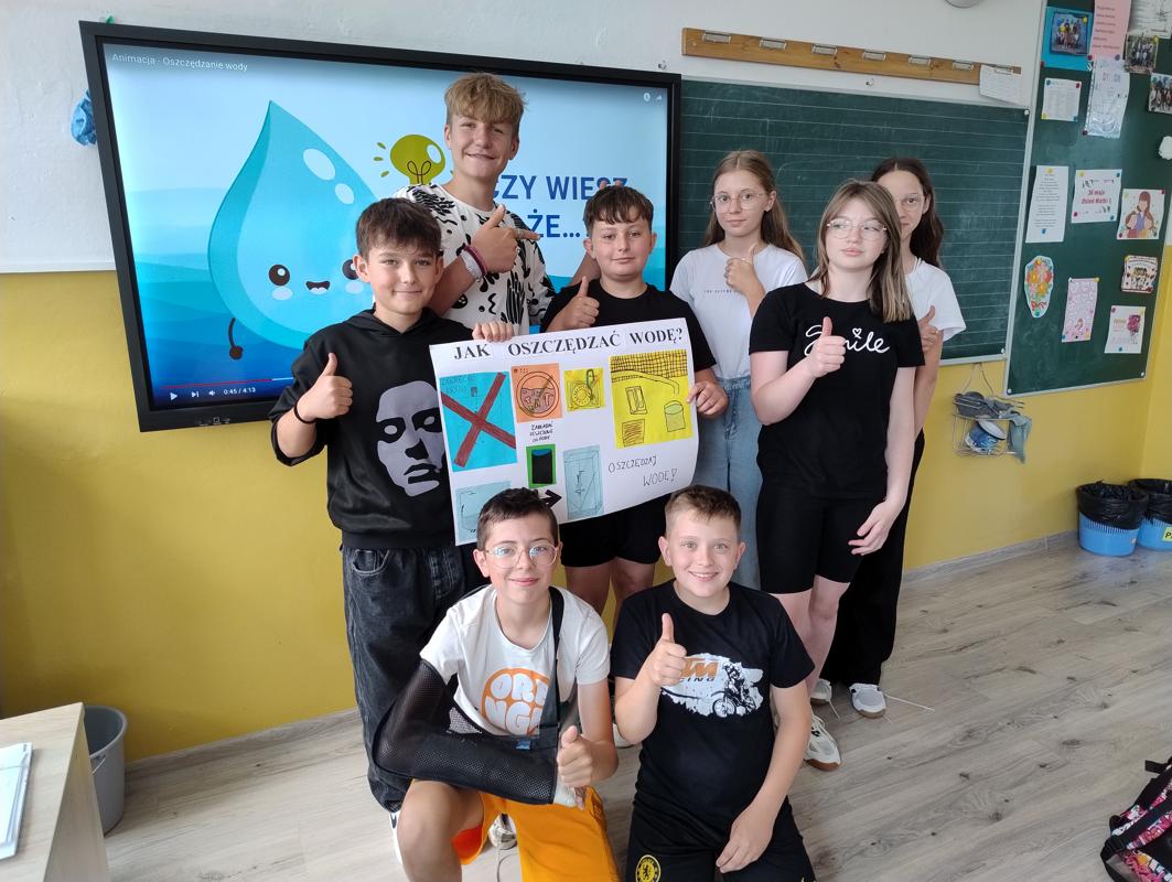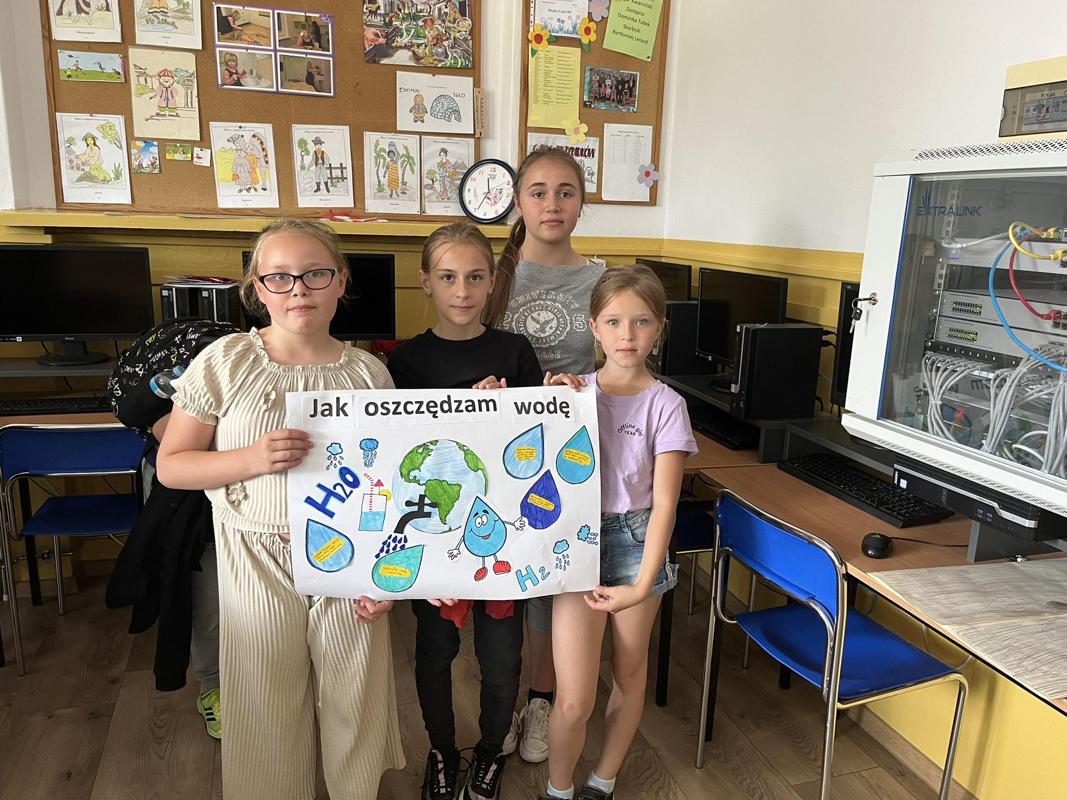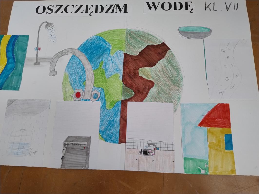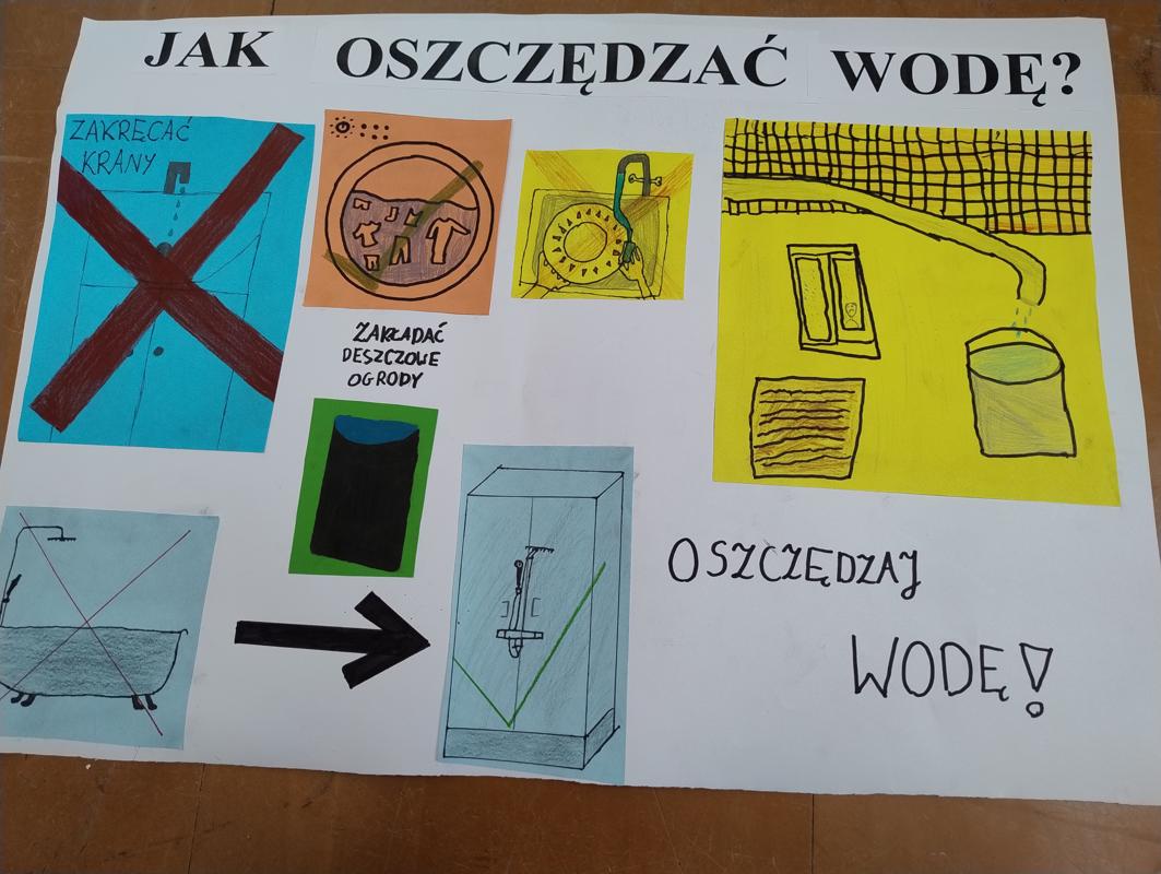 Od 3-6 czerwca 2024 r. uczniowie poszczególnych klas wykonywali plakaty ekologiczne ukazujące w jaki sposób można oszczędzać wodę. Podjęte działania poprzedzone były pogadankami i dyskusjami na temat konieczności ochrony środowiska a w szczególności oszczędzania wody. Zorganizowano także pokazy filmów edukacyjnych. Młodsi uczniowie wykonywali kolorowanki o tematyce wodnej oraz rozwiązywali krzyżówki i poznawali zasady oszczędzania wody. Zorganizowano także wyjścia w teren do tablic przyrodniczych ukazujących obieg wody w przyrodzie oraz małą retencję. Uczniowie klasy ósmej na lekcji biologii mierzyli ślad wodny.