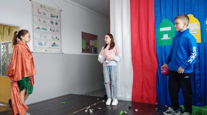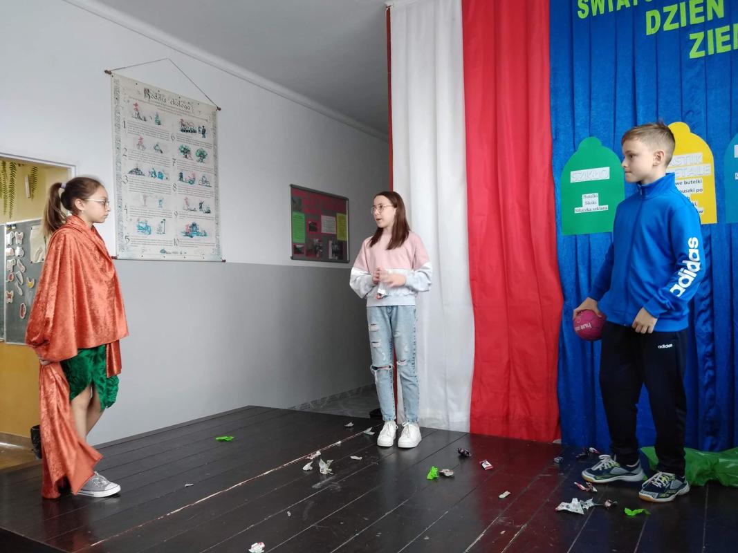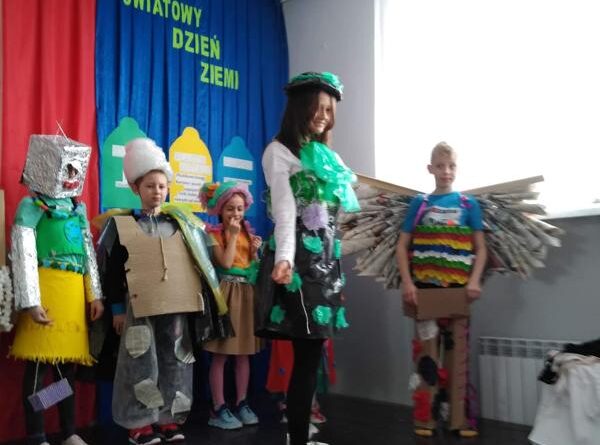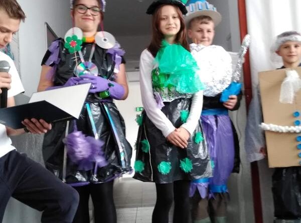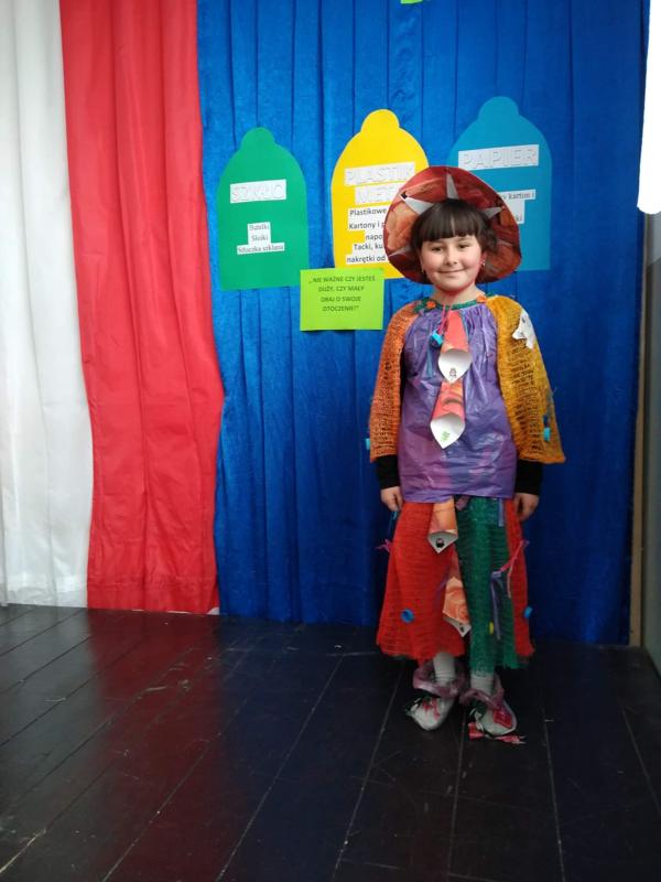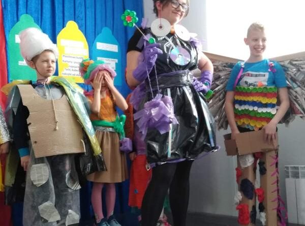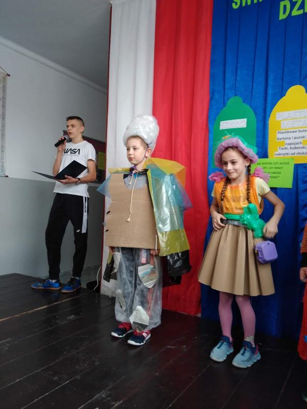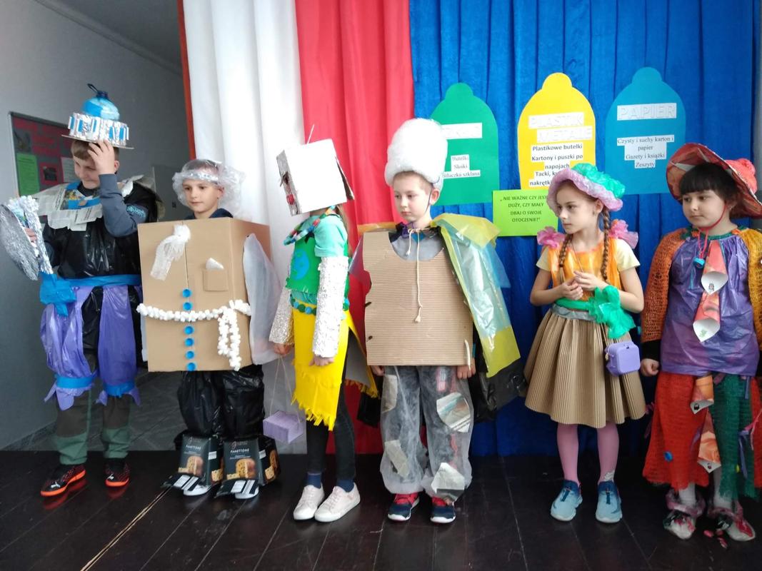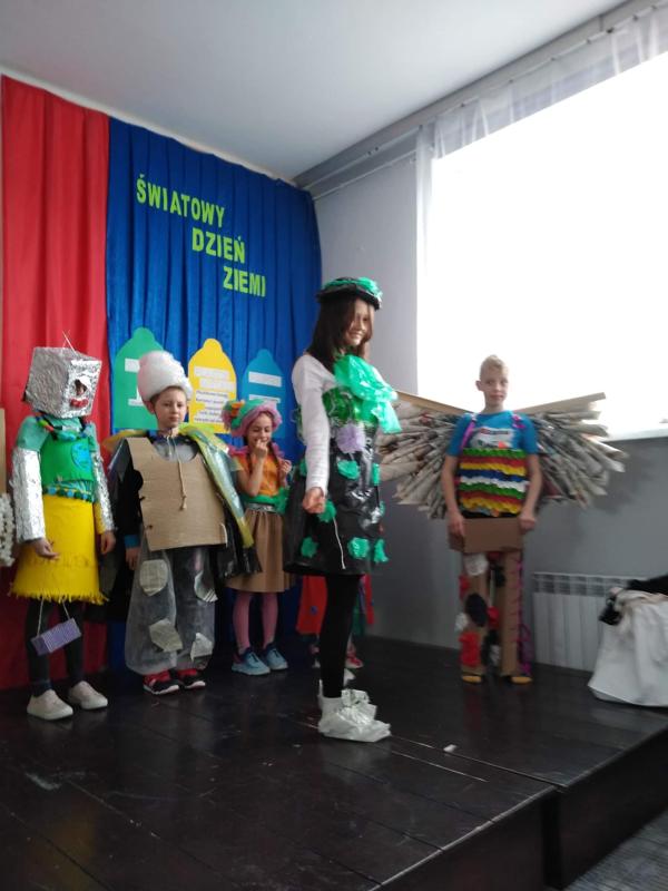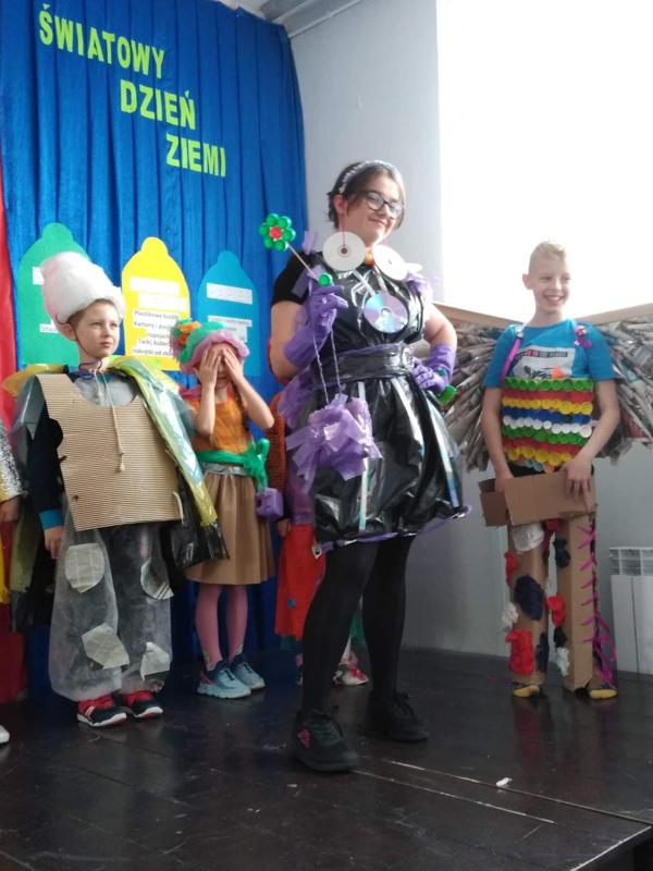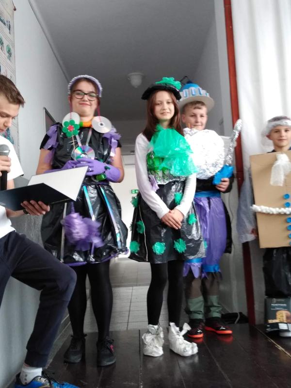 Następnie uczniowie zaprezentowali przedstawienie na temat segregacji śmieci. Po inscenizacji odbył się pokaz mody ekologicznej. Przedstawiciele poszczególnych klas prezentowali przygotowane przez siebie stroje z różnych odpadów. Kreatywność uczniów przeszła nasze oczekiwania. Można było podziwiać kreacje dyskotekowe, rycerskie czy nawet smoka. Na zakończenie uczestnicy pokazu mody otrzymali nagrody.