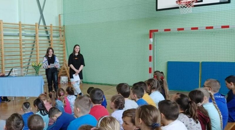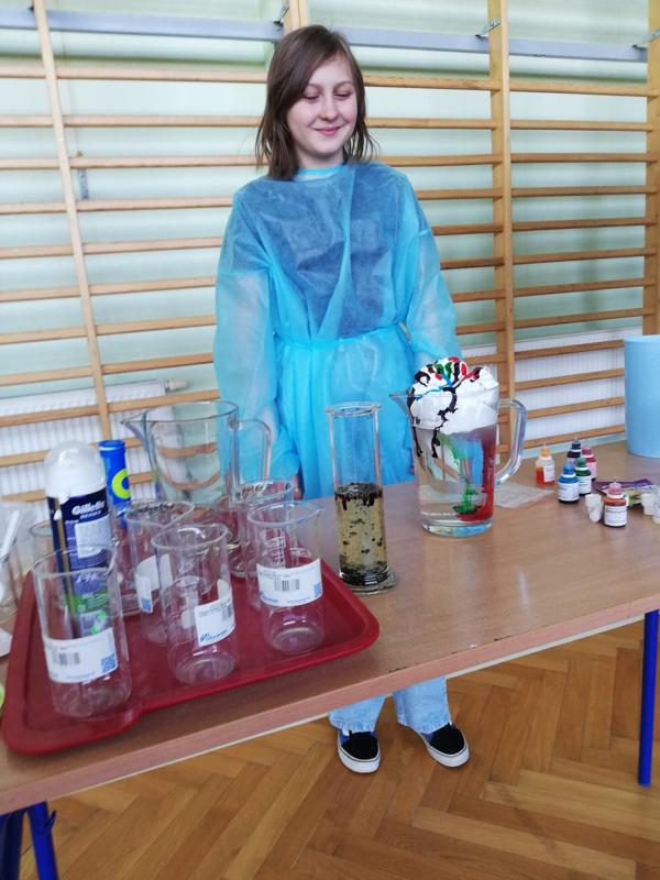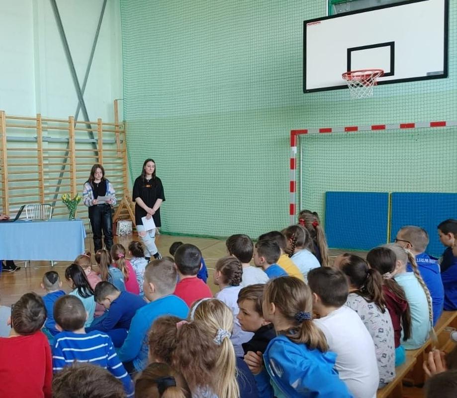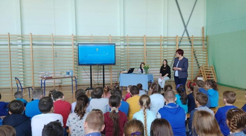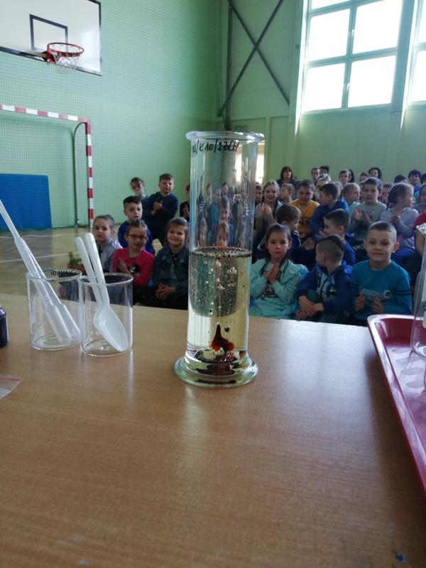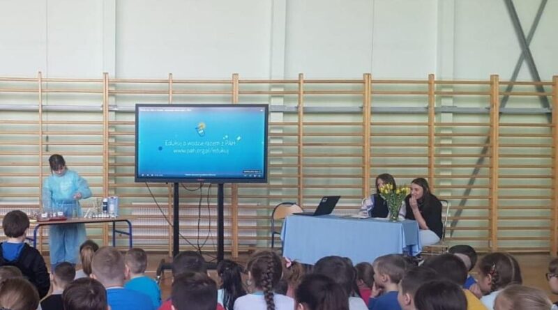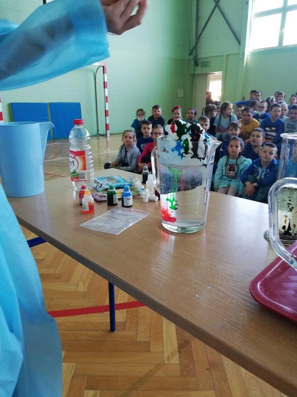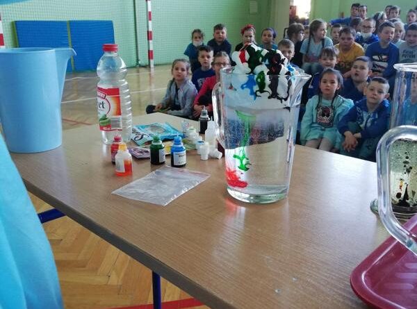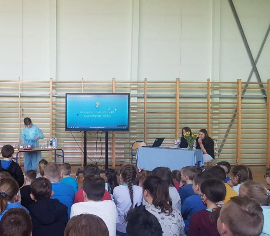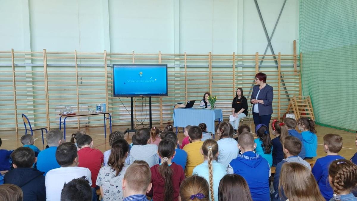 Zapoznali uczniów z animacjami: „Woda nie tylko w kranie” i „Oszczędzanie wody to za mało”, które pokazały znaczenie wody w życiu człowieka. Ponadto dowiedzieliśmy się, czym jest woda wirtualna i jakich ilości wody zużywa się do produkcji różnych produktów. Krótkie filmy ukazały nam problem braku wody w krajach Afryki oraz chorób związanych z zanieczyszczoną wodą. Poszukiwaliśmy sposobów na oszczędzanie wody w domu i szkole – nie zabrakło ciekawych pomysłów. Na zakończenie koleżanki z klasy szóstej zaprezentowały ciekawe eksperymenty z wodą np.: ,,Kolorowy deszcz” czy ,,Wulkan”.