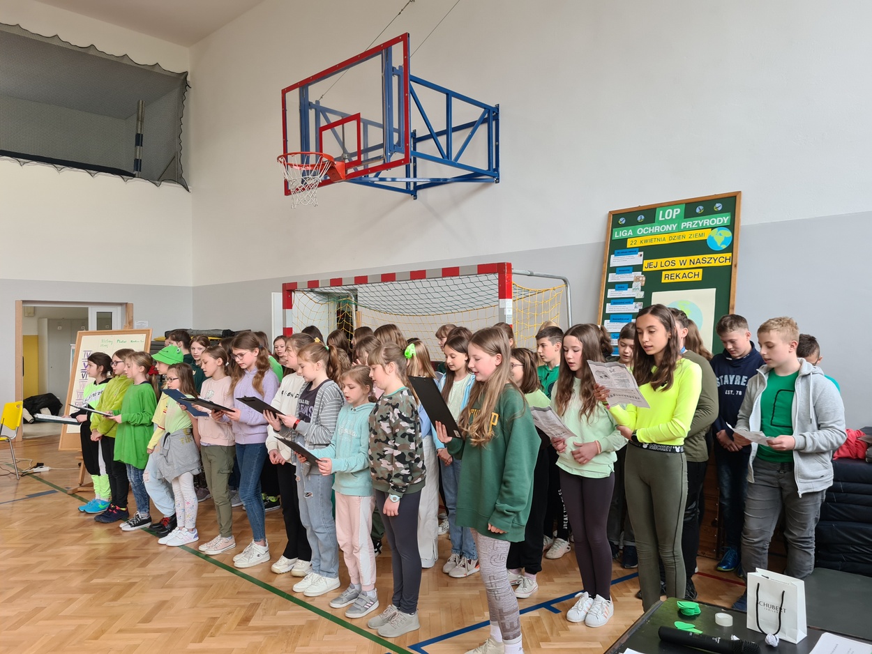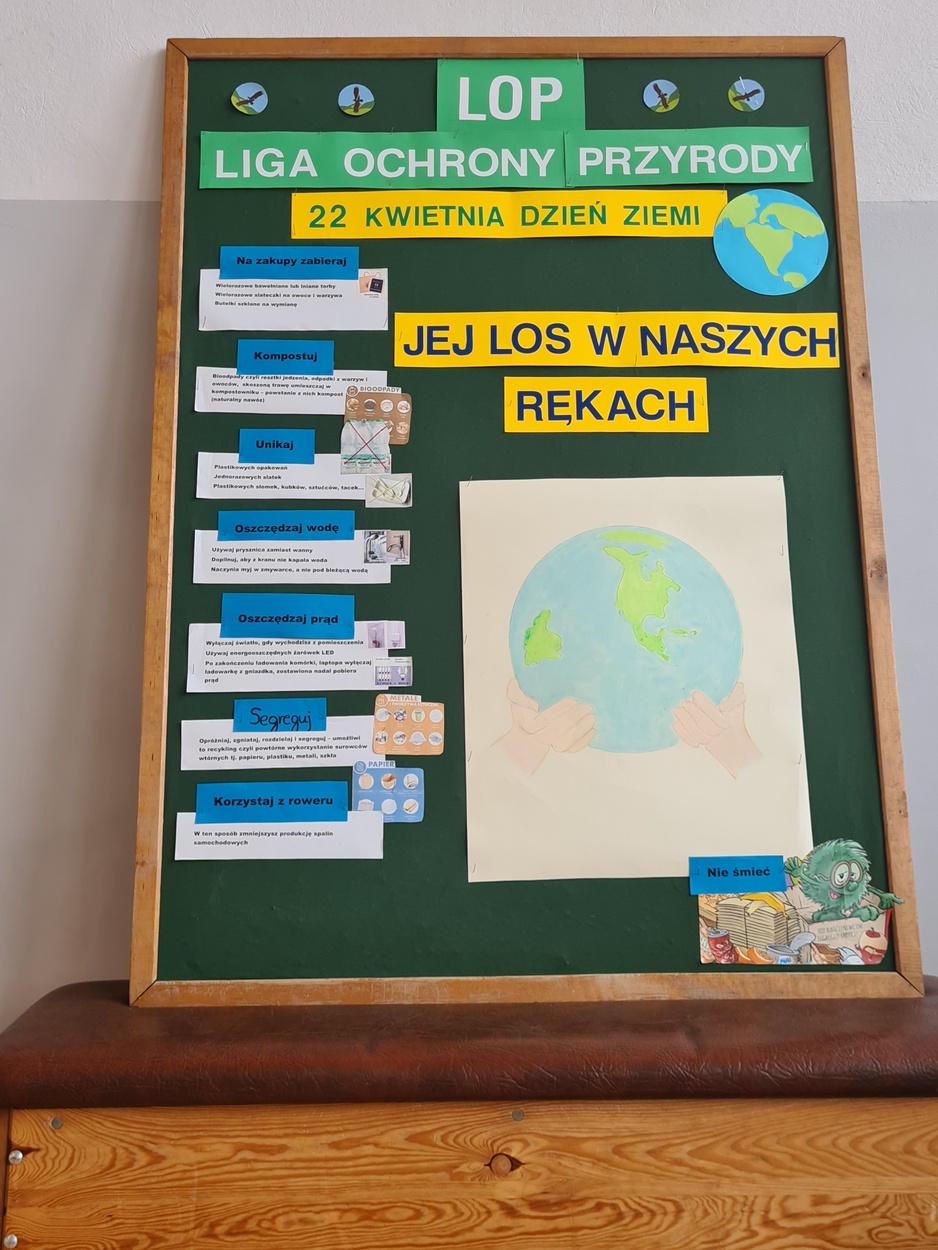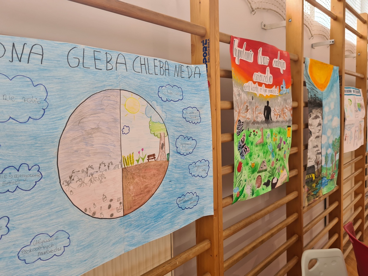 Wszystkie klasy przygotowały również plakaty promujące zachowania proekologiczne, które zdobią szkolny korytarz i przypominają o właściwym stosunku człowieka do przyrody. Większość uczniów w tym dniu ubrała się symbolicznie na kolor zielony.
