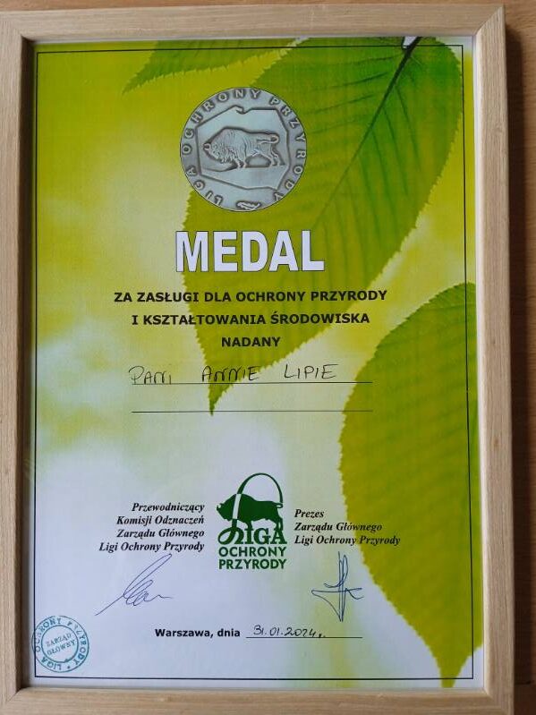 Zarząd Główny LOP w Warszawie, na wniosek Zarządu Okręgu w Nowym Sączu i Oddziału LOP w Gorlicach, doceniając długoletnią pracę i zaangażowanie na rzecz edukacji ekologicznej, przyznał nauczycielce naszej szkoły Pani Annie Lipa medal „Za zasługi dla Ochrony Przyrody i Kształtowanie Środowiska”. Uroczyste wręczenie nagrody odbyło się 29 maja 2024 r. podczas II sesji Rady Miejskiej w Bieczu, gdzie z rąk Burmistrza Biecza – Pana Mirosława Wędrychowicza i Przewodniczącego Rady Miejskiej w Bieczu – Pana Grzegorza Nosala oraz Prezesa Oddziału LOP w Gorlicach – Pani Grażyny Kurzawa, nauczycielka odebrała nagrodę.
