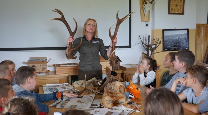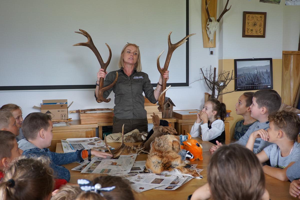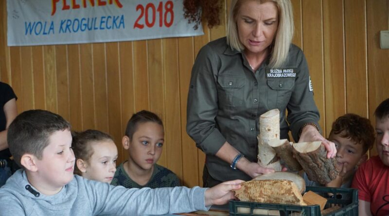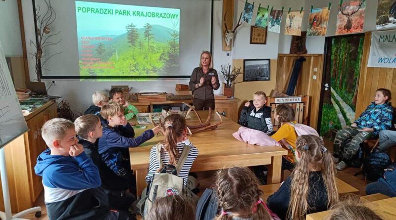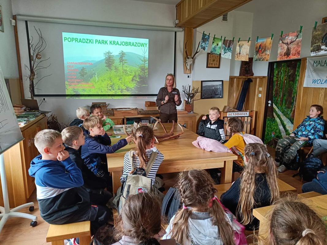 Uczniowie podzieleni na dwie grupy uczestniczyli w prelekcji na temat historii parku, jego flory i fauny. Rozpoznawali gatunki drzew i zwierząt, poznawali życie pszczół. Zajęcia te odbywały się w Popradzkim Centrum Edukacyjnym (PCE) w Woli Kroguleckiej koło Barcic. Uczniowie brali też udział w zajęciach terenowych, udali się ścieżką przyrodniczą na platformę widokową w kształcie ślimaka. Jest to wyjątkowy punkt widokowy (ok. 550 m n.p.m.), z którego podziwiali wspaniałą panoramę Beskidu Sądeckiego z pasmem Jaworzyny Krynickiej i pasmem Radziejowej, a także rzekę Poprad. Zajęcia prowadzili edukatorzy PCE, którym bardzo dziękujemy za ciekawy przekaz wiedzy.