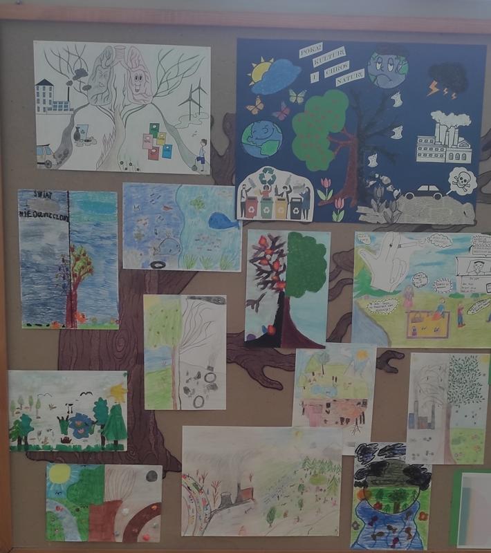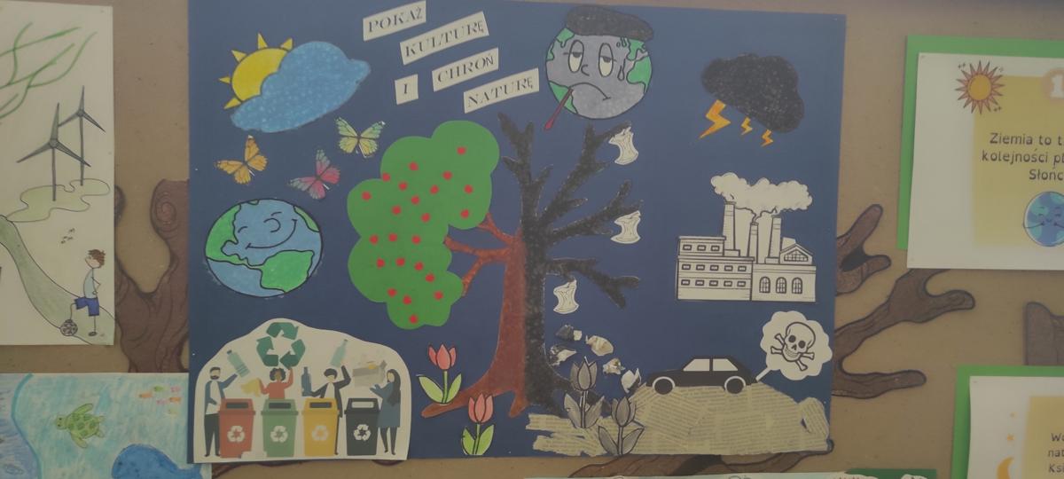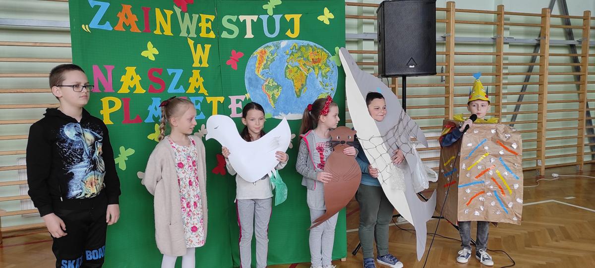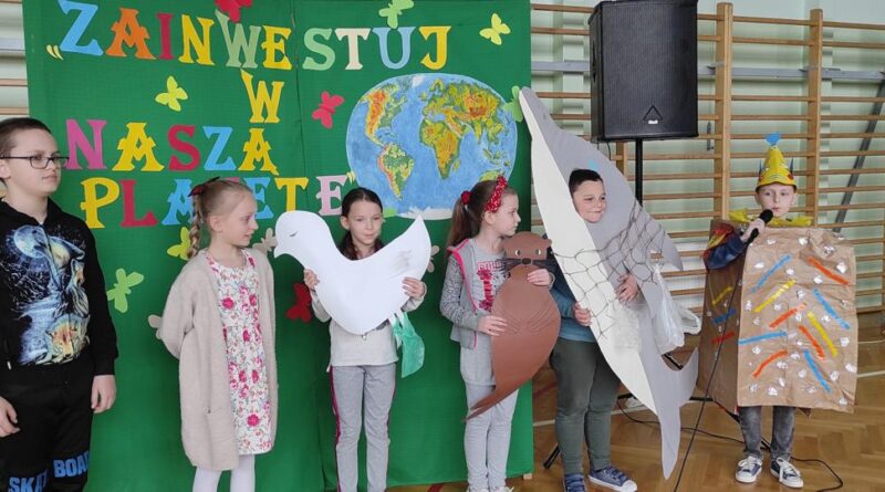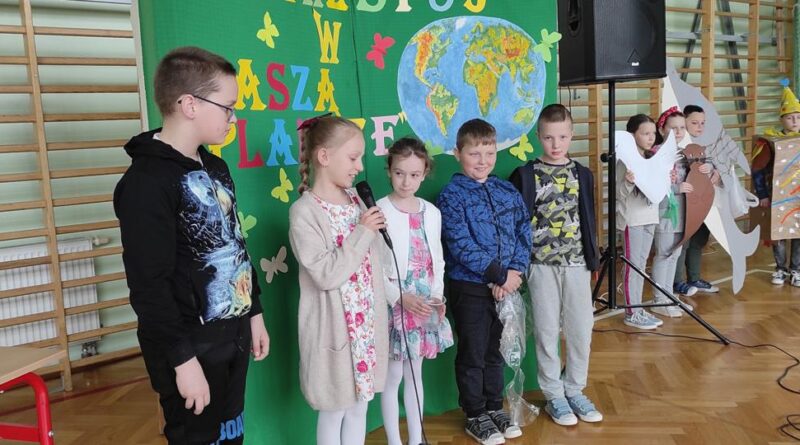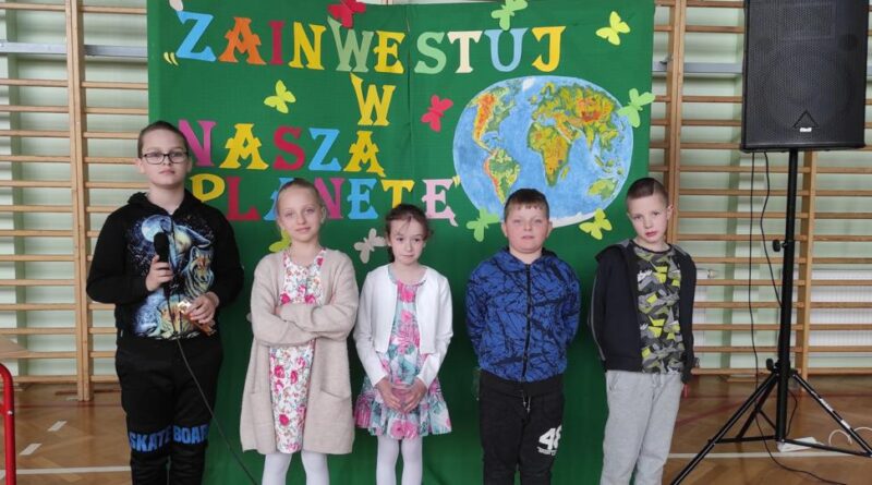 Dnia 22 kwietnia w naszej szkole obchodziliśmy Dzień Ziemi. Z tej okazji podjęliśmy wiele ciekawych wyzwań i działań. Powstała gazetka tematyczna, na której zaprezentowane zostały plakaty przygotowane przez uczniów klasy piątej, promujące wartość dbałości o naszą planetę. Zorganizowaliśmy Konkurs Ekologiczny „EKO – KREACJA”, którego finał miał miejsce podczas apelu 22 kwietnia. Konkurs cieszył się dużym zainteresowaniem szczególnie wśród klas 0 – 4. Cała szkoła uczestniczyła w apelu poświęconym Dniu Ziemi.