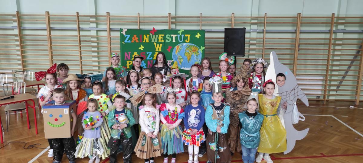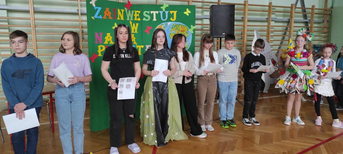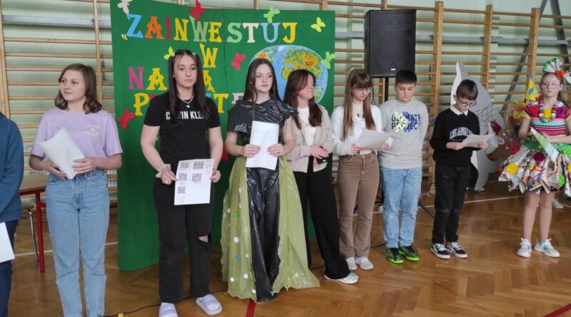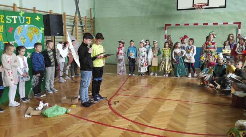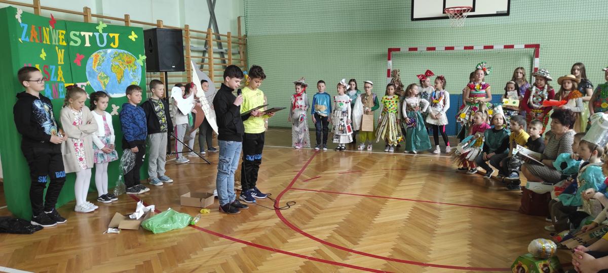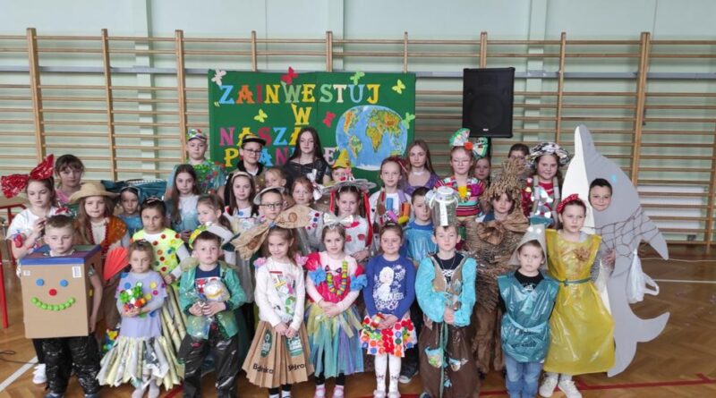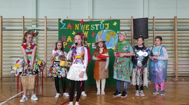 Na początku wysłuchaliśmy informacji na temat historii obchodów Dnia Ziemi. Następnie klasa trzecia przedstawiła inscenizację o tematyce ekologicznej. Kolejnym punktem programu była prezentacja strojów konkursowych. Różnorodność, pomysłowość i kreatywność młodych twórców eko-mody była ogromna. Jury miało trudny orzech do zgryzienia. Przeprowadziliśmy konkurs wiedzy dla przedstawicieli klas 4 – 8. Polegał on na wykonaniu przygotowanych zadań przez przedstawicieli każdej klasy. Zadania stworzone zostały w oparciu o wiedzę podawaną podczas trwającego apelu. Aby wykonać zadania należało wykazać się uwagą i wiedzą. Dodatkową atrakcją było zakodowanie pytań przy użyciu kodów QR. Po rywalizacji nastąpiło ogłoszenie wyników konkursu klasowego i konkursu „EKO – KREACJA”. Pamiętajmy o tym, aby inwestować w naszą planetę.